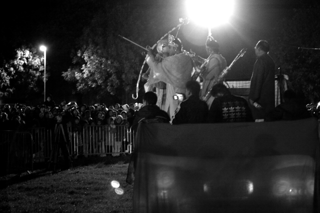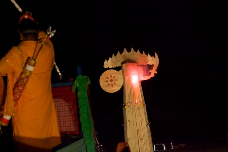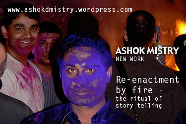 “Re-enactment by fire” looks at the receipt of a narrative and propagation and evolution of a belief through communal ritual and in particular amongst migrant communities. The photographs follow the practice of Hindu festivals such as Holi and Dasera in Britain. The images have been created over five years. The work also questions the motives of photographers who create exotic images from the lives of people in remote parts of India. The images attempt to capture an Indian exoticism in a European context.