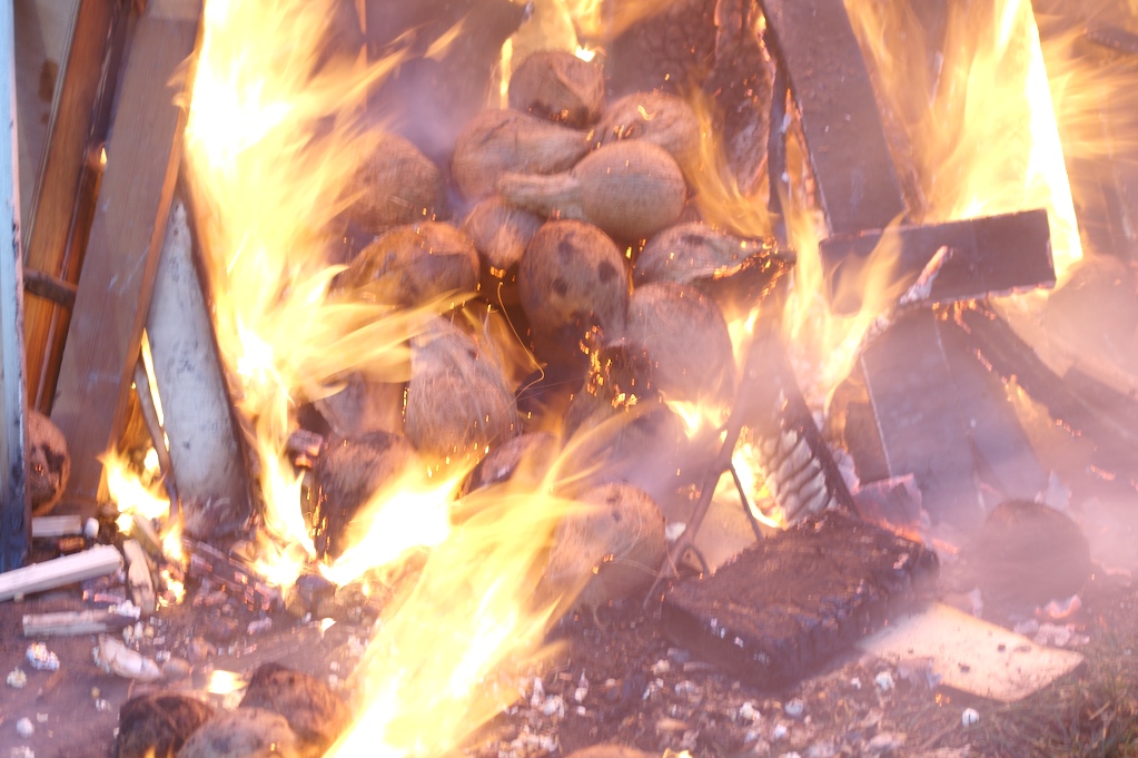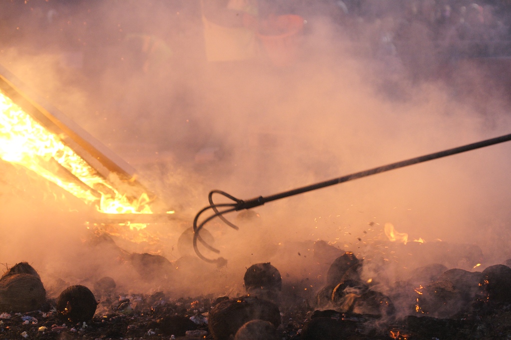 The water that fell on the grass and turn to mud. Many of the old ladies came dressed in Chappal (slippers) which would get stuck in the mud and cause a myriad of other problems. As time passed the flames got larger and the crowd more excited. Volunteers hurled coconuts and popcorn into the flames as offerings. The half-burnt coconuts were dragged out of the flames and taken away. There is a strong belief in sin amongst the hindu community and a willingness to be purified of sin. To me the coconuts symbolised a body and its immersion into the fire can be seen as an aspiration to be cleansed.