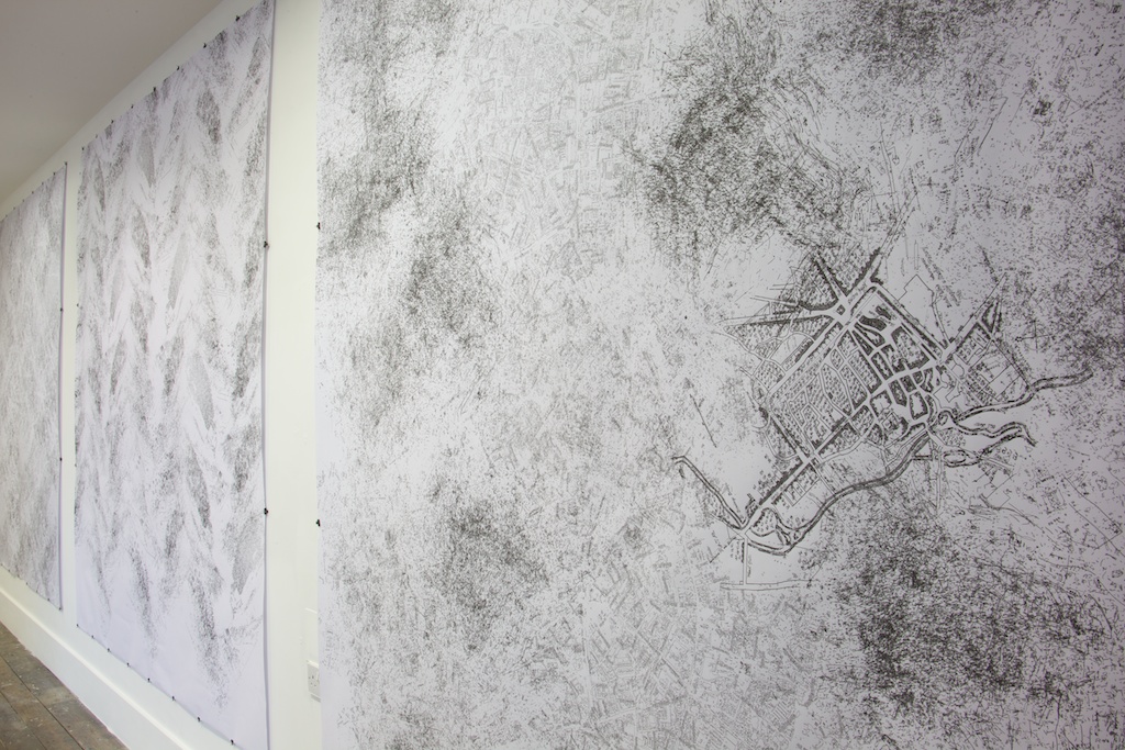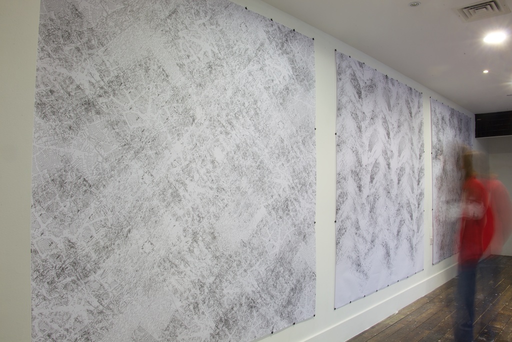 For the purposes of the installation the activator and inhibitors can be a number of events, public trends, policy rulings or opinions related to memory. Activators include redevelopment, new development or economic confidence whilst the inhibitor include historical significance, social change or economic viability. Motifs representing the activators and inhibitors were mapped over plans of urban centres. The result was a series of large-scale schematic-like generative compositions chronicling, economic optimism, social decline, regeneration or dereliction. The compositions depict the formation of patterns when different data is mapped to the topology of a city.