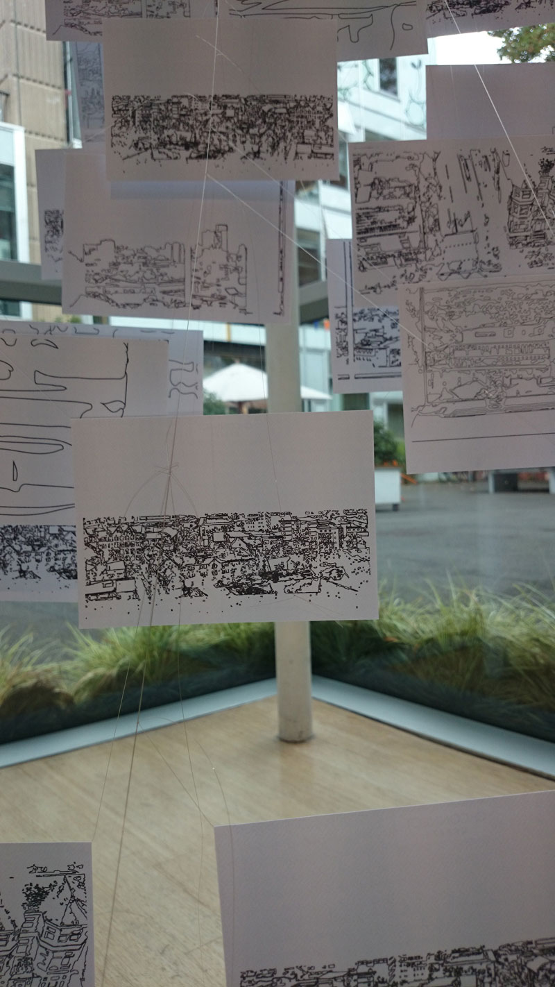 The installation explores themes of belonging and value and looks at how meaning, association and kinship are generated or derived from our environment. Views of Leicester taken from the twelfth floor of New Walk Centre have been reduced to linear drawings. The installation attempts to anonymise the landscape by stripping away defined markers of value, thereby creating a situation from which the viewer can re-imagine the city without distraction. The individual linear drawings become units of value and are repeated to form a landscape. Perspective is narrowed and disrupted creating a promenade for the eye to travel along. The images were developed in close consultation with people working in the buildings being demolished.