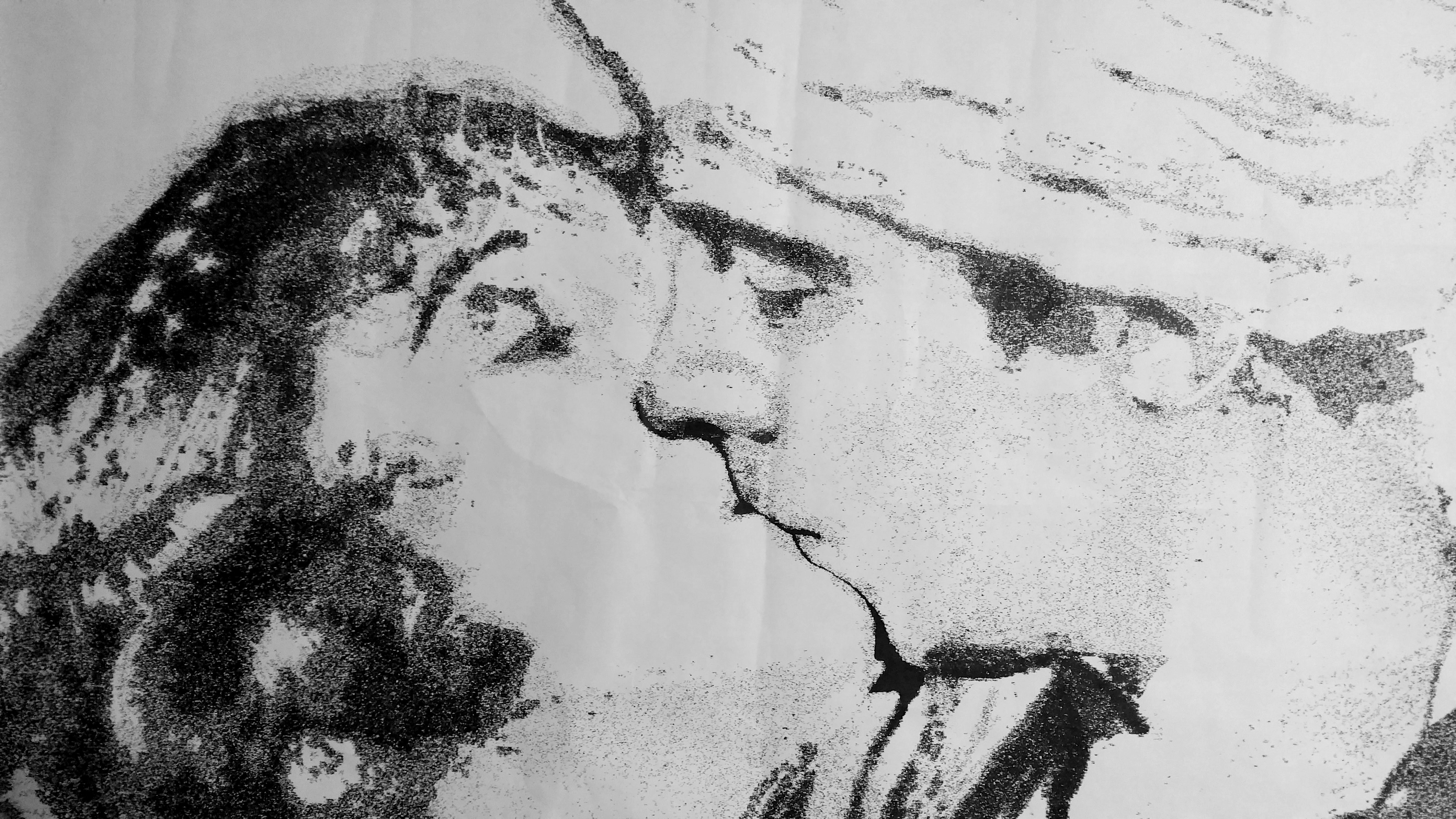A large scale digital drawing on plain paper depicting a scene from the the movie titled ‘The Sheik’ 1918 starring Rudolph Valentino.