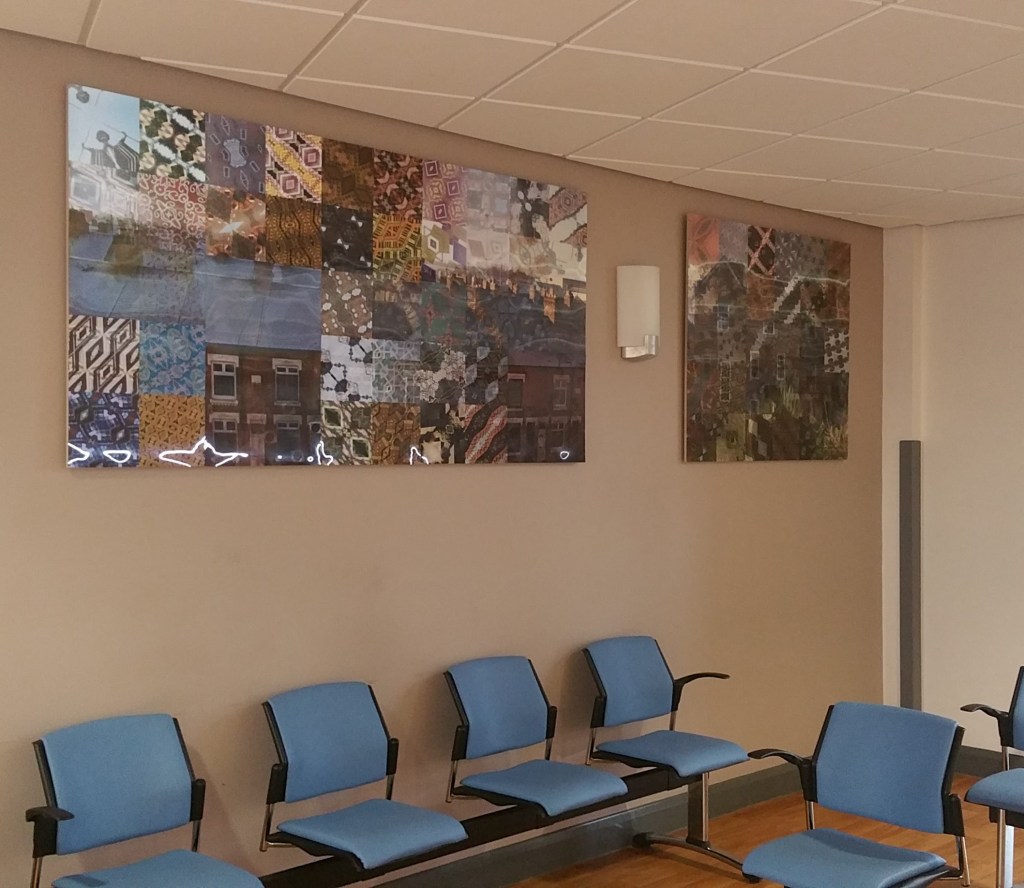 2012 – A public artwork created for Belgrave Health Centre in Leicester. The artwork is created using lenticular panels which change as the viewer walks past. The images depict the shifting centres of Belgrave from the 18th Century to now. One of the images shows the rooftops of houses off Belgrade road in Leicester and patterns made of items available in the area. the other image shows an image of Belgrave Hall and images of items on display in Belgrave hall from the period.