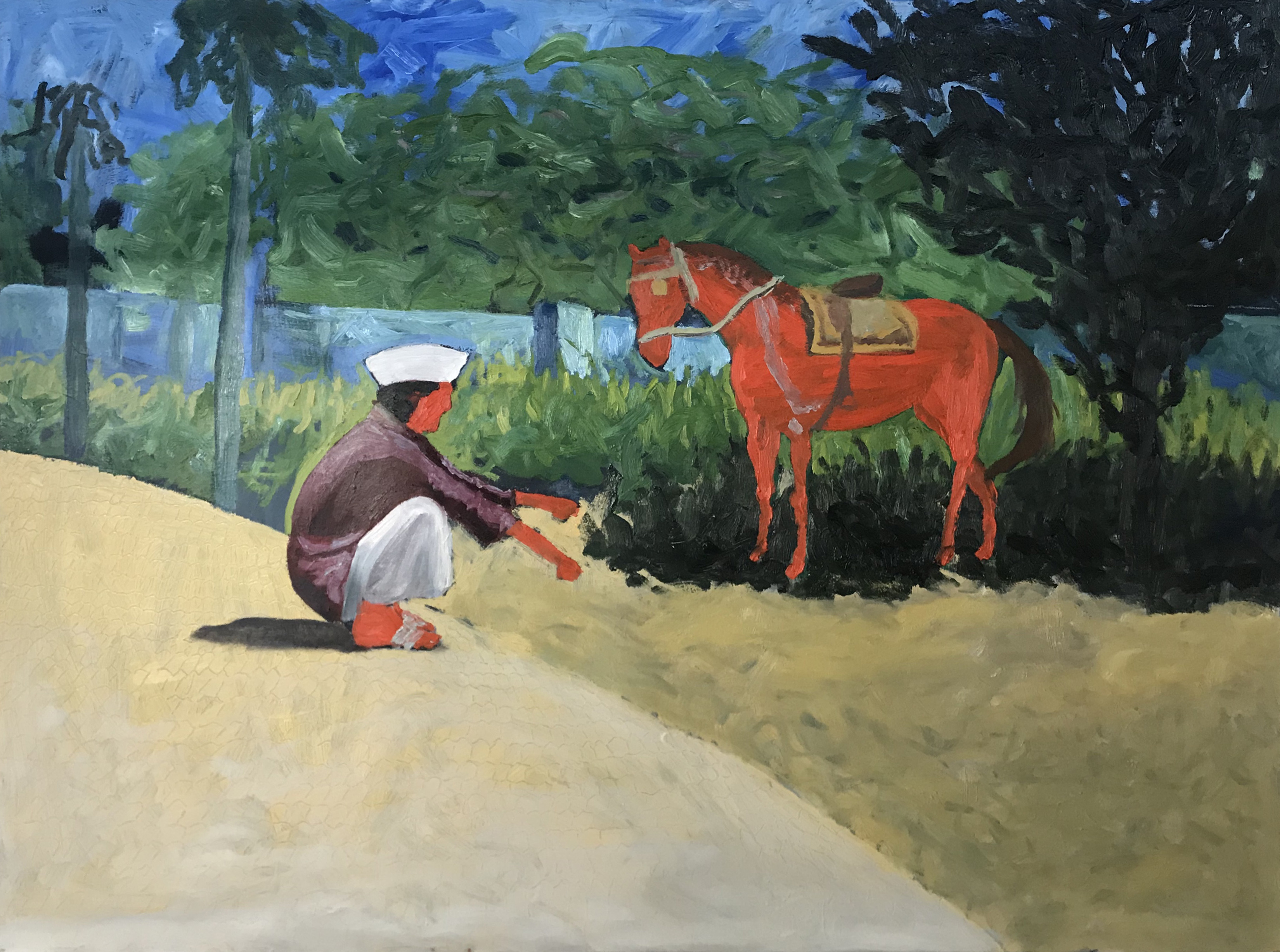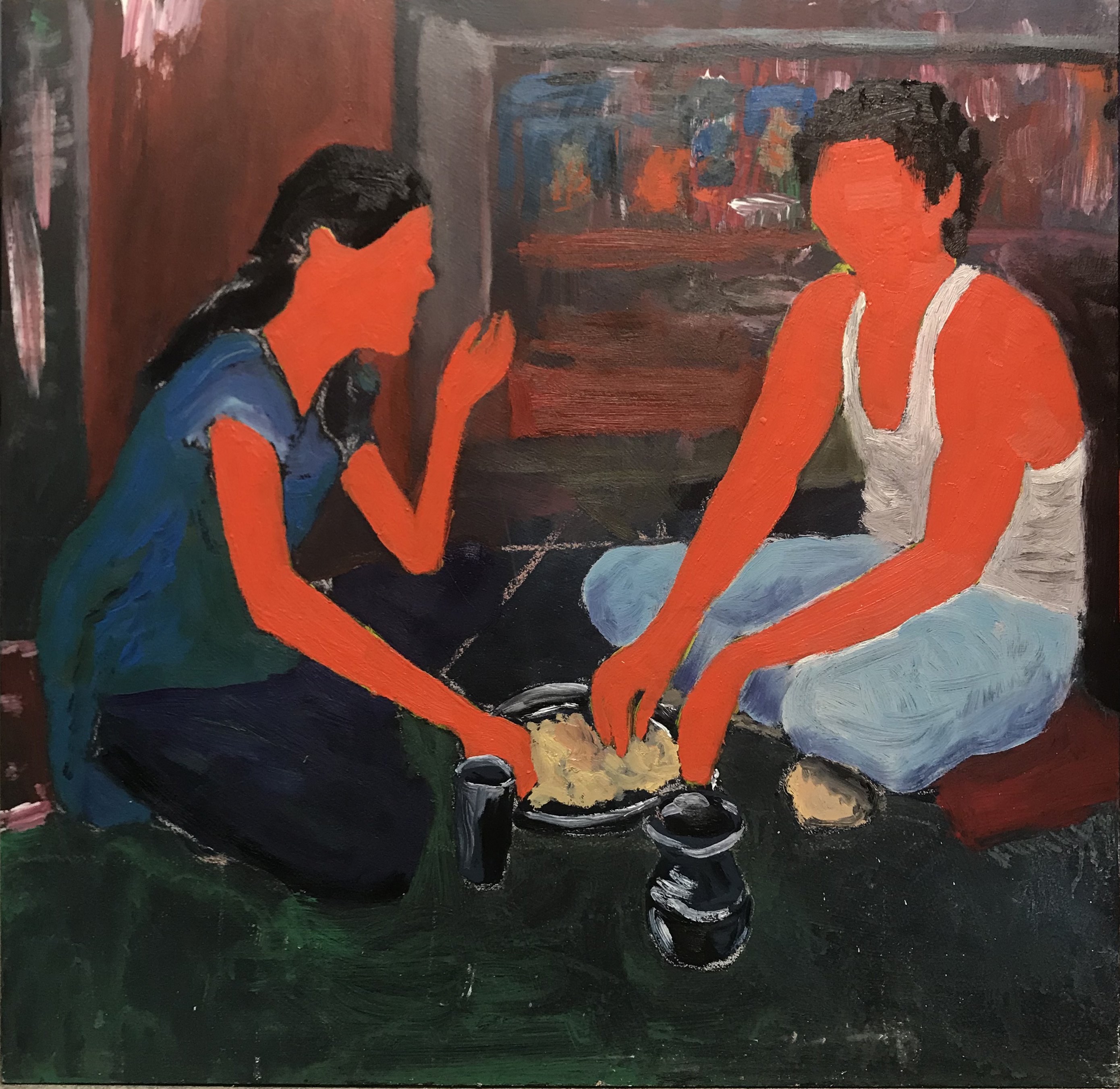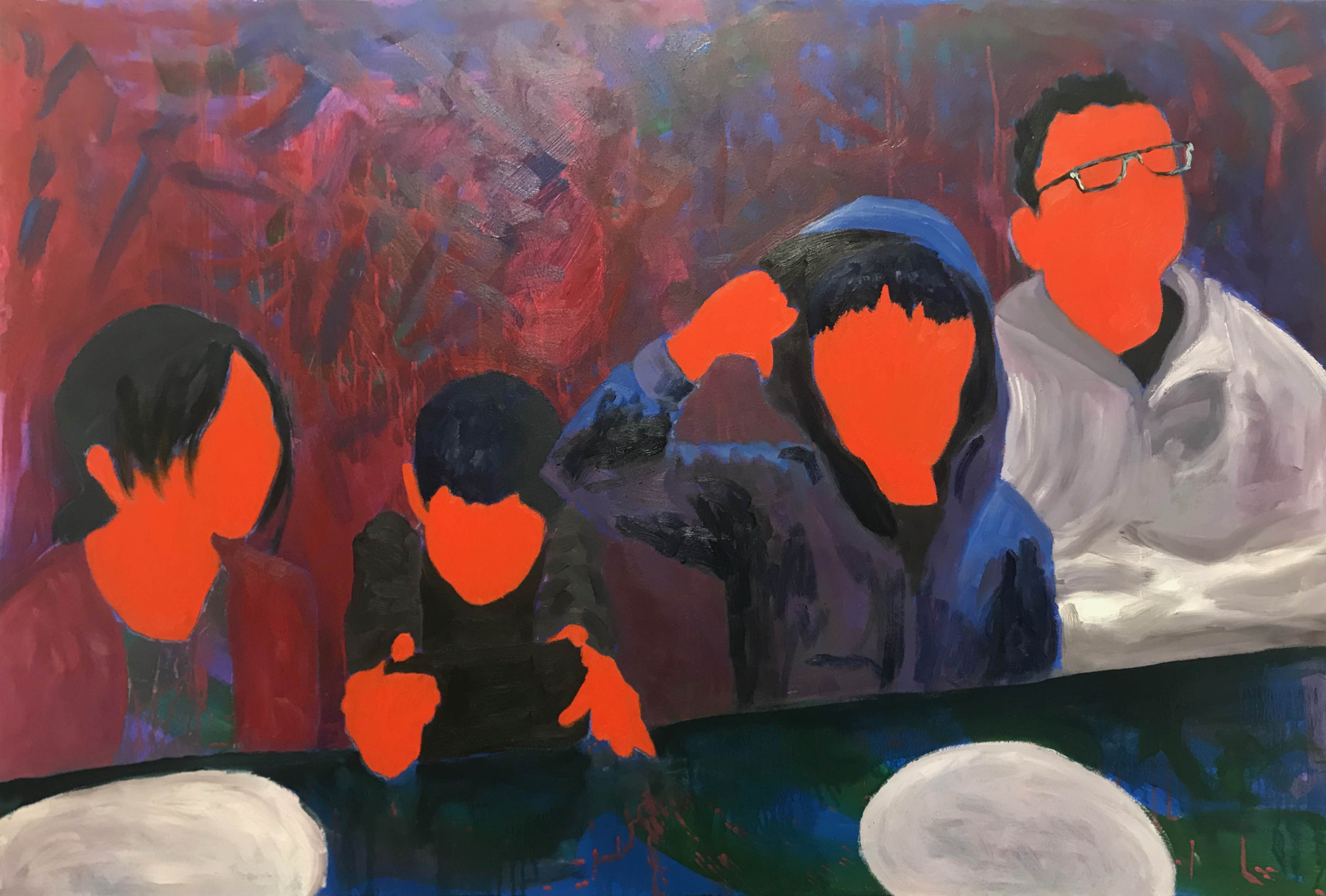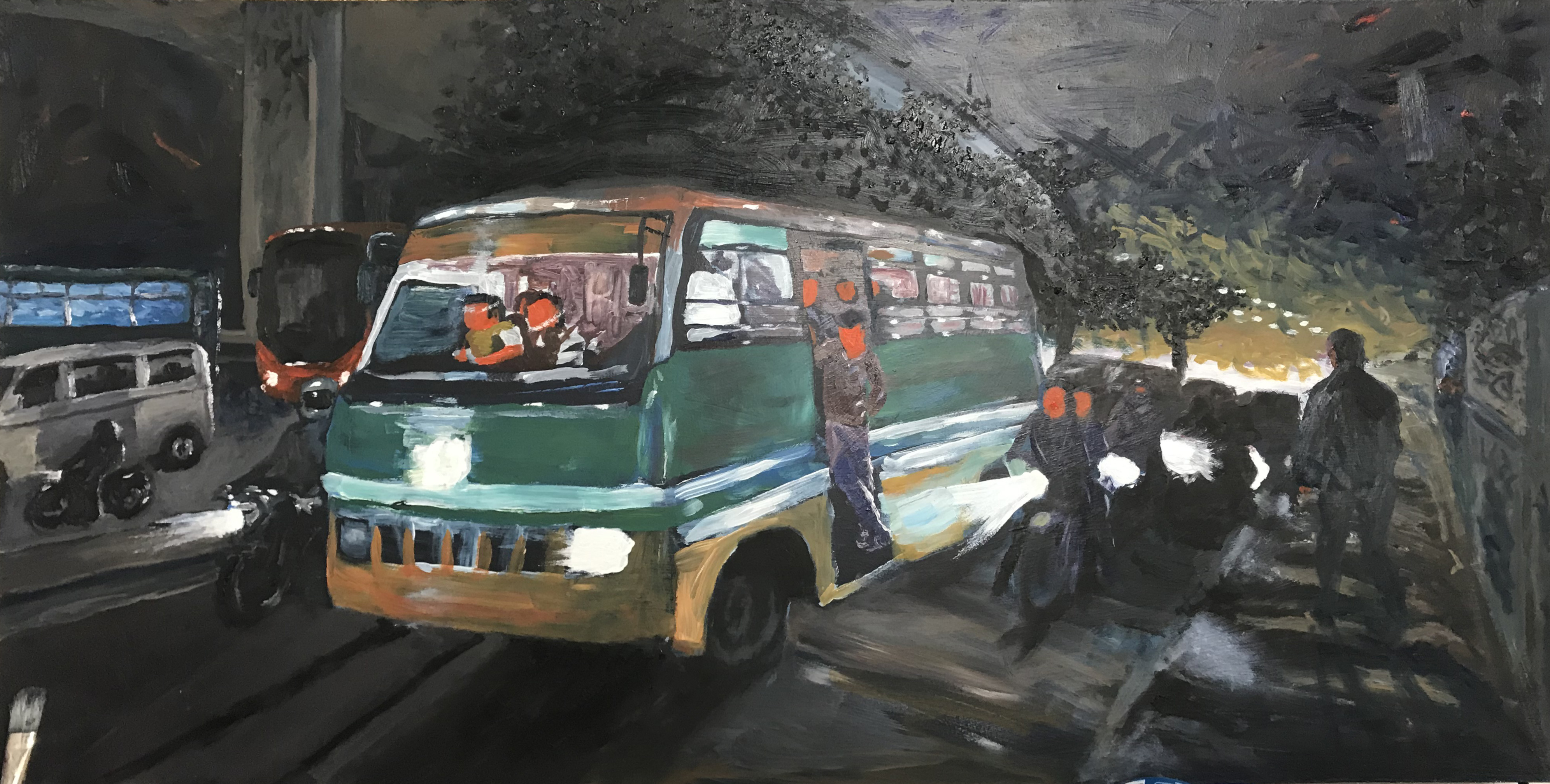 The paintings are dream like reinterpretations with jarring depth and vivid colours that spit details that wakes you in a cold sweat. In dreams you can recognise people but you don’t know why, because you couldn’t see their faces. You could recognise intangible values of their being such as the gait of their walk, their build and gestures, or the context of their existence.